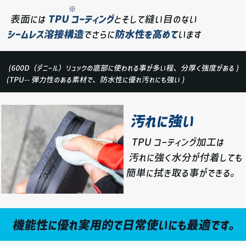 表面にはTPUコーティングとそして縫い目のないシームレス溶接構造でさらに防水性を高めています。