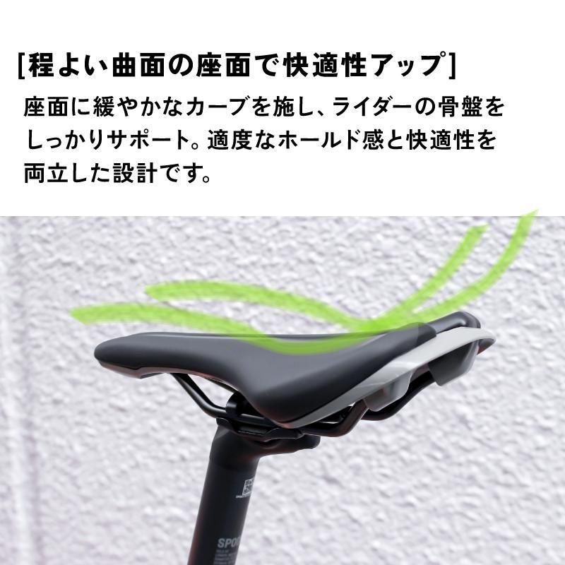 座面に緩やかなカーブを施し、ライダーの骨盤をしっかりサポート。適度なホールド感と快適性を両立した設計です。