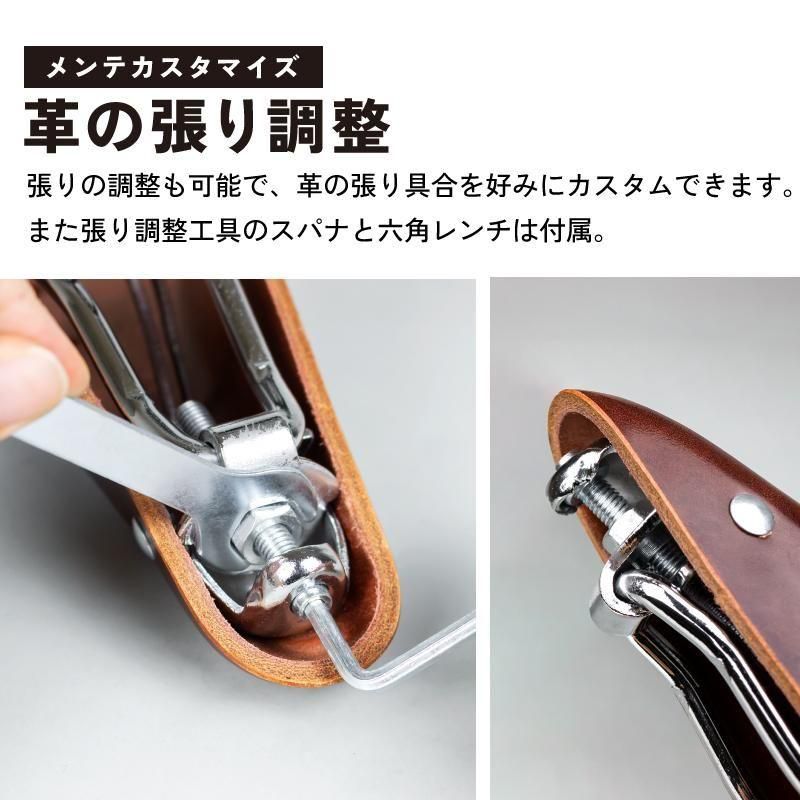 張り調整工具(六角レンチ、スパナ)、収納用不織布バッグ付き。張りの調整も可能で、革の張り具合を好みにカスタムできます。