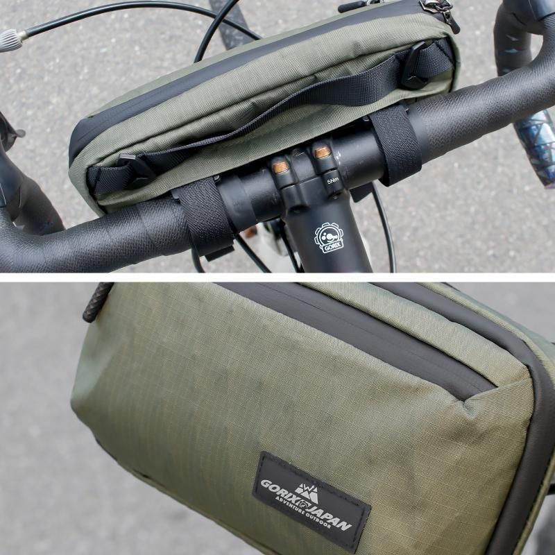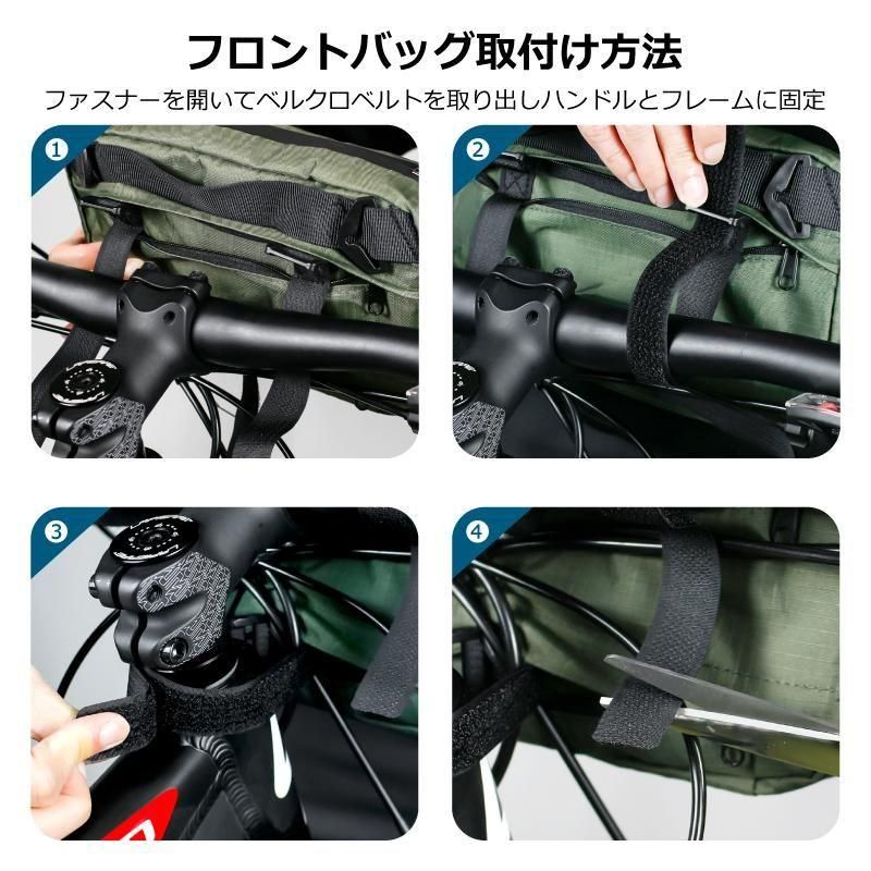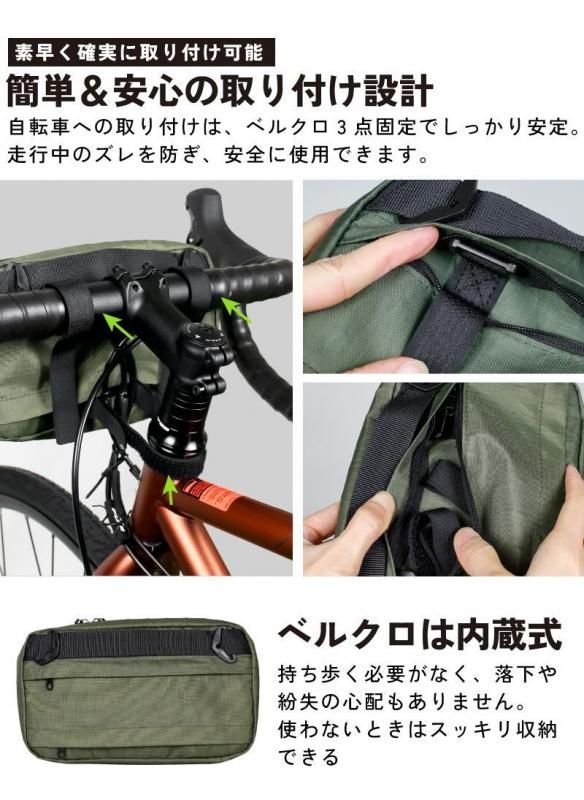 取り付け時はファスナーを開いてベルクロベルトを取り出し、ハンドルやフレームにしっかり固定するだけ。