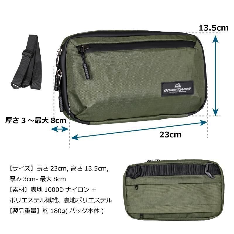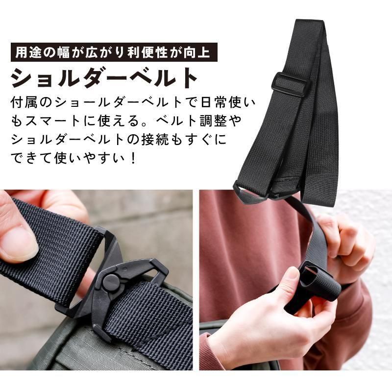仕様 | ベルクロベルトによる三点固定、内蔵式ベルクロベルト、撥水性表地・防水ファスナー、ハンドルバッグ&ショルダーポーチの2WAY |