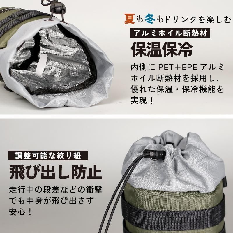 ボトルポーチの内部にはアルミ箔の断熱材を採用しており、飲み物の温度を長時間キープします。