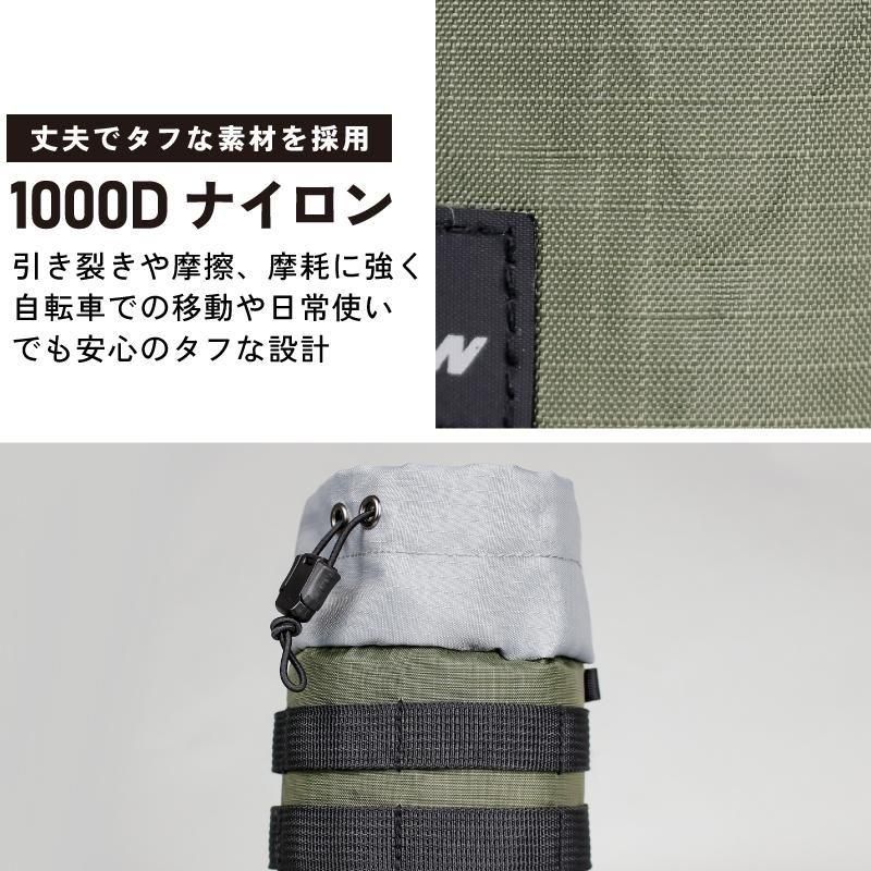 自転車を降りた後も便利に持ち運べ、ペットの散歩やアウトドアなどさまざまなシーンで活躍します。素材には耐久性・防水性に優れた1000Dナイロンを使用し、引き裂きや摩耗に強いタフな設計。