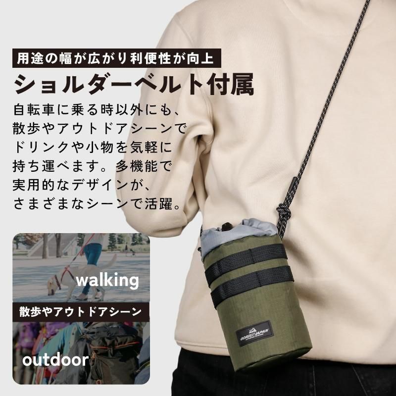 自転車に乗るときはボトルポーチとして、降りた後は肩にかけて持ち運べるため、使い勝手が抜群です。