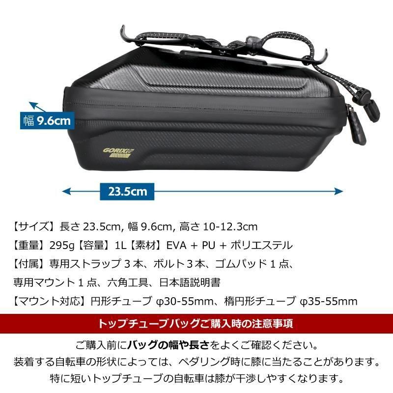 使用上の注意事項 | ご購入前にバッグの幅や長さをよくご確認ください。装着する自転車の形状によっては、ペダリング時に膝に当たることがあります。特に短いトップチューブの自転車は膝が干渉しやすくなります。 |