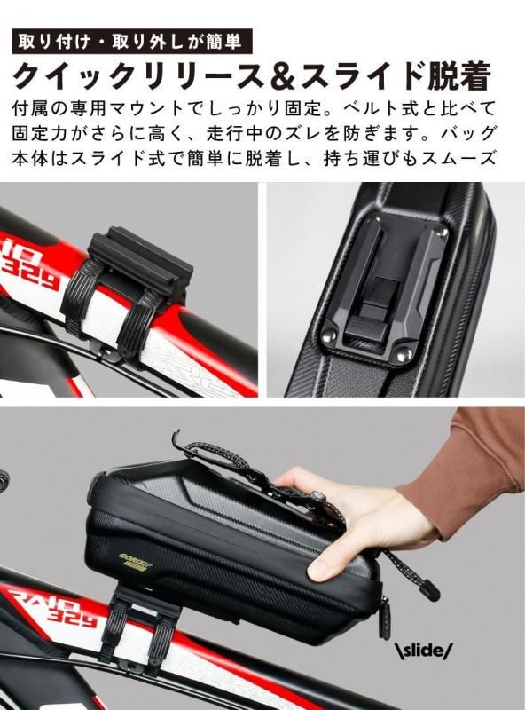 雨や泥はねにも強く、全天候に対応するトップチューブバッグで快適なサイクリングをサポートします。