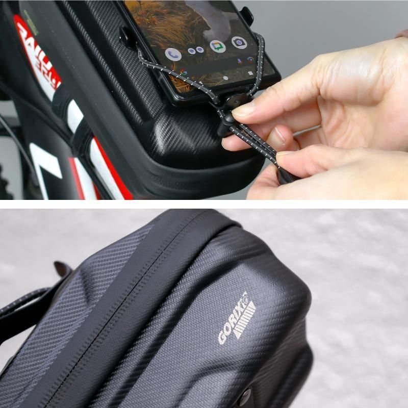 トップチューブバッグにはスマホをしっかり固定できるマウント機能を搭載。