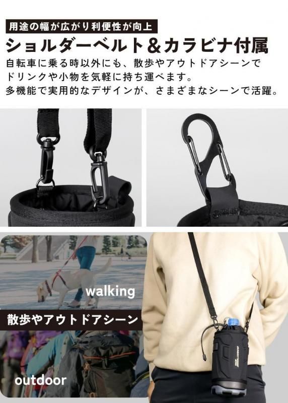 自転車に乗る時以外にも、散歩やアウトドアシーンでドリンクや小物を気軽に持ち運べます。