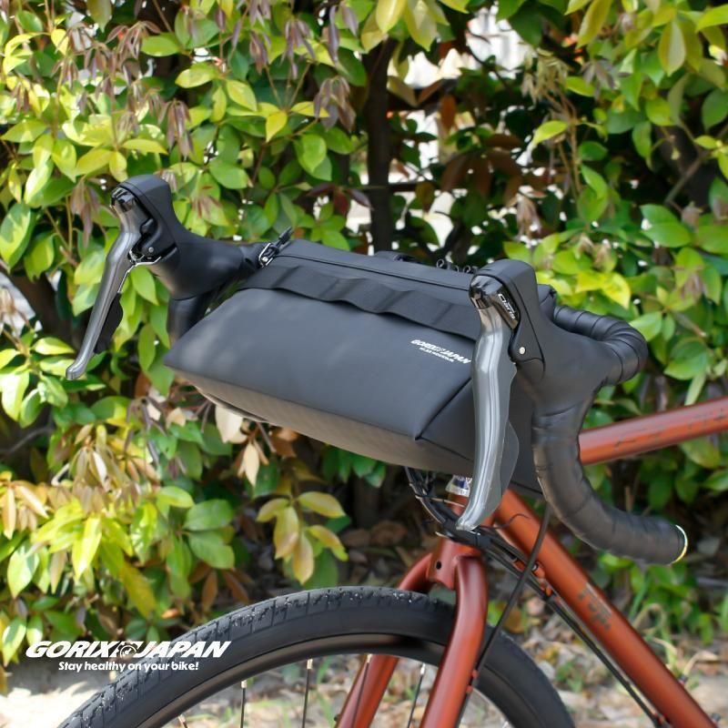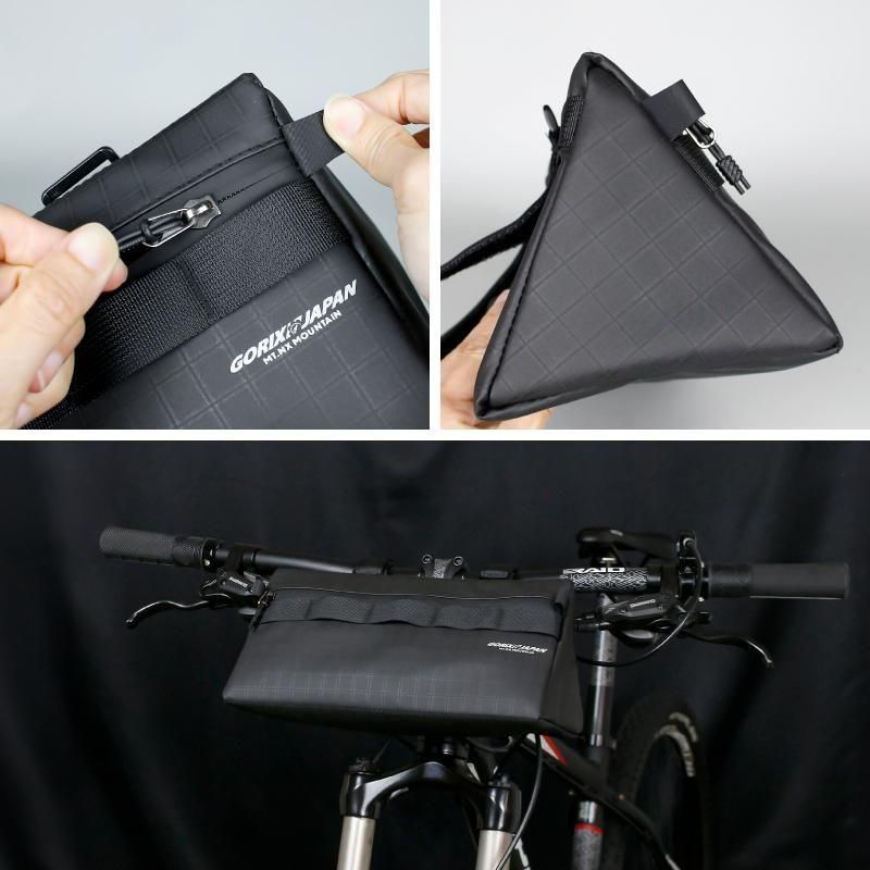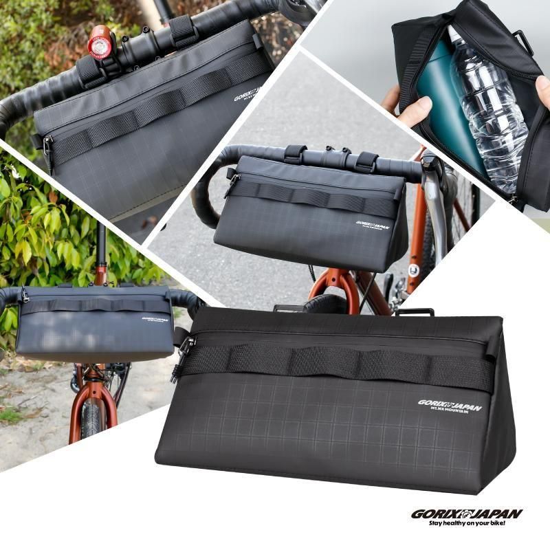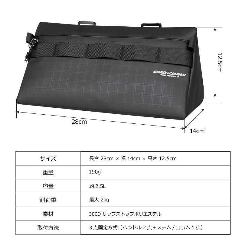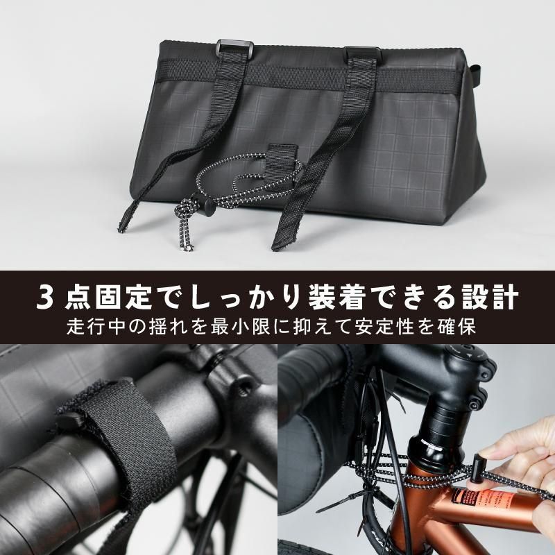 ハンドルバー下にスッキリ収まる三角形状で、500mlペットボトルが余裕で入る約28cmの横幅。