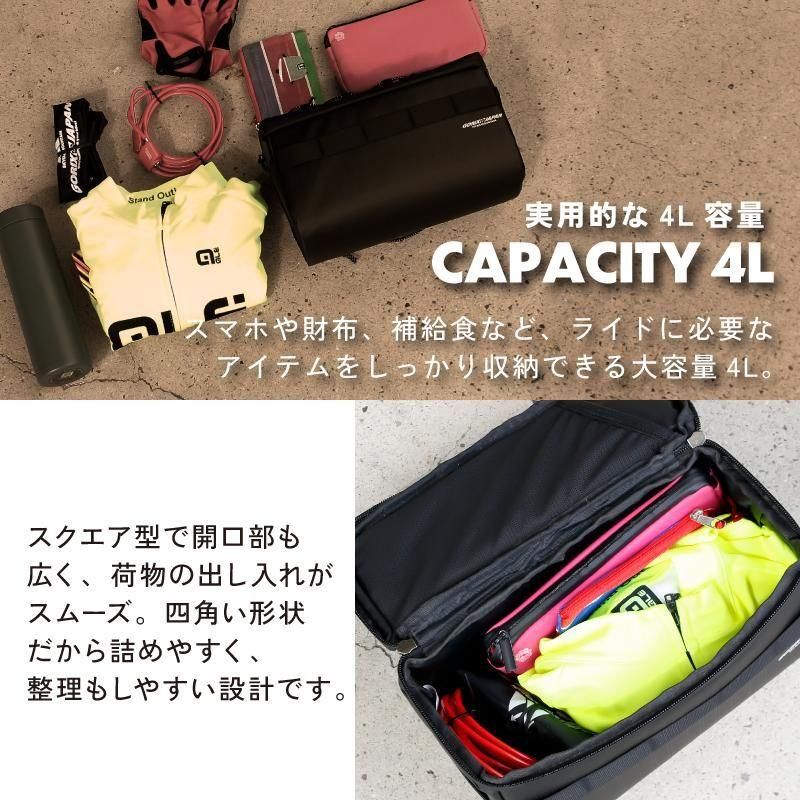 スマホや財布、補給食など、ライドに必要なアイテムをしっかり収納できる大容量4L。