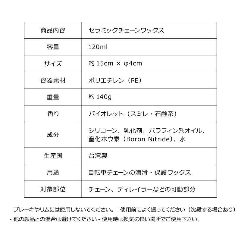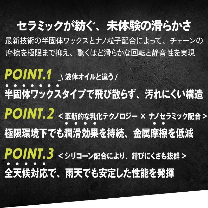 雨天でも安心。ロングライドでも快適。チェーン潤滑に求められるすべてを備えたセラミックワックスです。