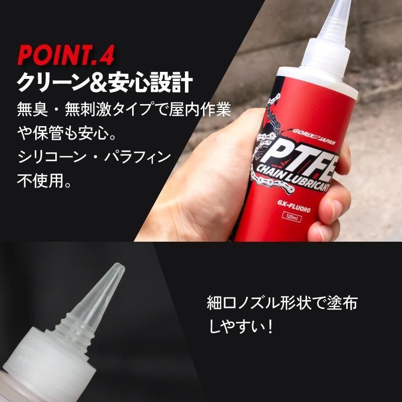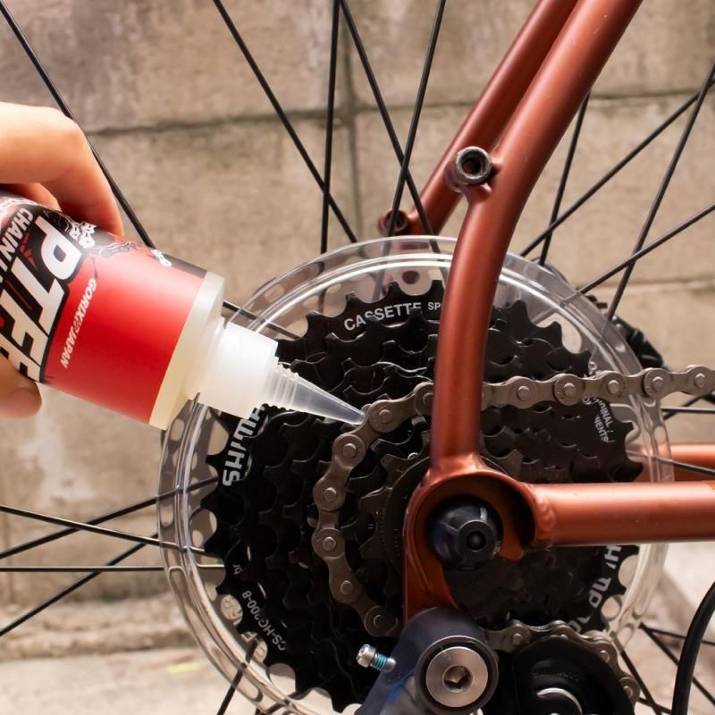 チェーン、ギア、ディレイラーなどの可動部に使用可能。細口ノズルで注油がしやすく、洗浄なしでも再塗布OK。