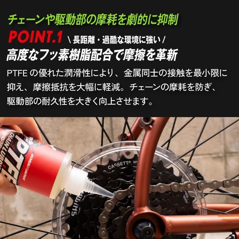 PTFE(テフロン)配合の高性能チェーンルブ。摩擦を抑え、静かで滑らかなペダリングを長時間持続。ロングライドやヒルクライムに最適。