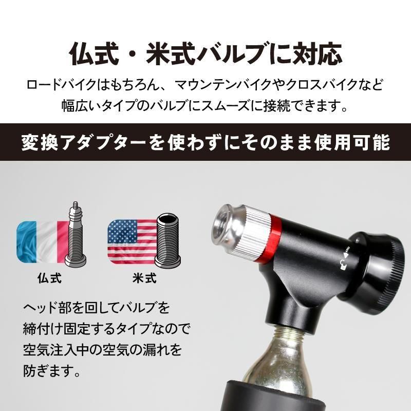 本CO2インフレーターは、仏式(フレンチバルブ)と米式の両方に対応しており、変換アダプターを使わずにそのまま使用可能です。