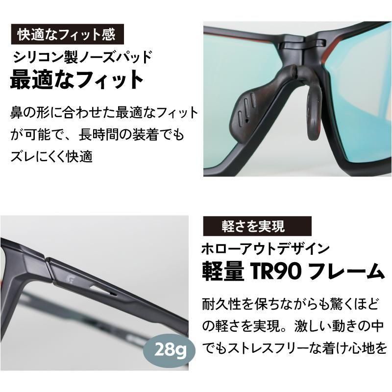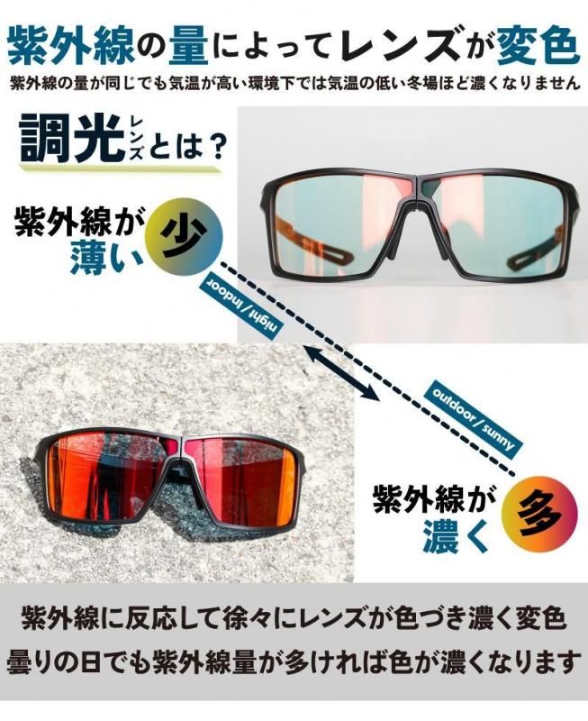 レッドカラーの調光レンズは特有のコントラスト強調効果を持ち、屋外スポーツやアウトドア環境でも快適な視界を提供します。