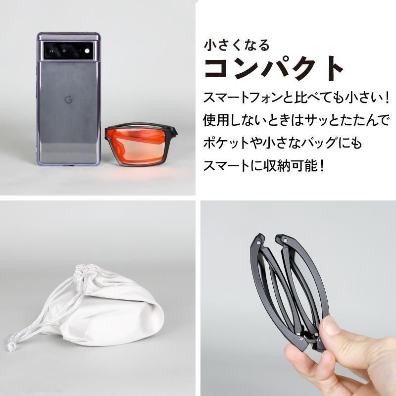 屋内ではクリア、屋外では鮮やかなレッドに変色し、眩しさを軽減しながら高コントラストで物体の輪郭をくっきりと映し出します。