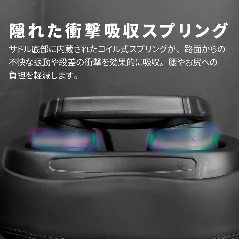 幅広で分厚い高反発クッションと、底部の内蔵型コイル式スプリングが路面からの衝撃を強力に吸収し、お尻と腰の負担を大幅に軽減します。