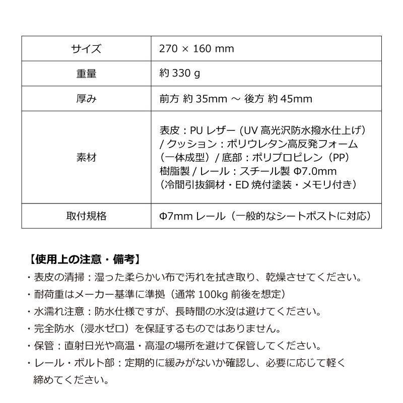 | 使用上の注意・備考 | ・表皮の清掃:湿った柔らかい布で汚れを拭き取り、乾燥させてください。・耐荷重はメーカー基準に準拠(通常100kg前後を想定)・水濡れ注意:防水仕様ですが、長時間の水没は避けてください。・完全防水(浸水ゼロ)を保証するものではありません。・保管:直射日光や高温・高湿の場所を避けて保管してください。・レール・ボルト部:定期的に緩みがないか確認し、必要に応じて軽く締めてください。 |