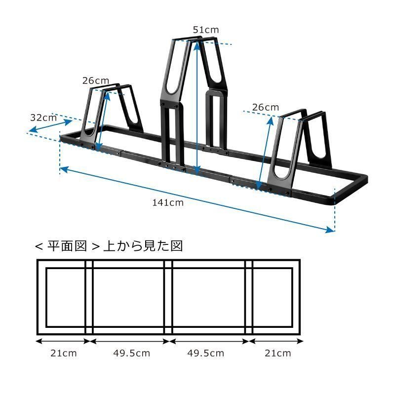| 使用上の注意 | ・設置時に地面とのわずかな隙間が生じる場合がありますが、使用上の問題はございません。・本製品は、タイヤ幅58mm以下の二輪自転車(MTB、ロード、クロスバイクなど)に対応しています。・安定した使用のため、組み立て後はしっかりと固定し、定期的にネジの緩みなどを点検してください。・本製品は屋内および屋外で使用可能ですが、屋外使用時は定期的に錆止め処理を推奨します。・収容台数および対応サイズを超える自転車は使用しないでください。・強風地域で使用する際は、アンカー固定を推奨します。 |
