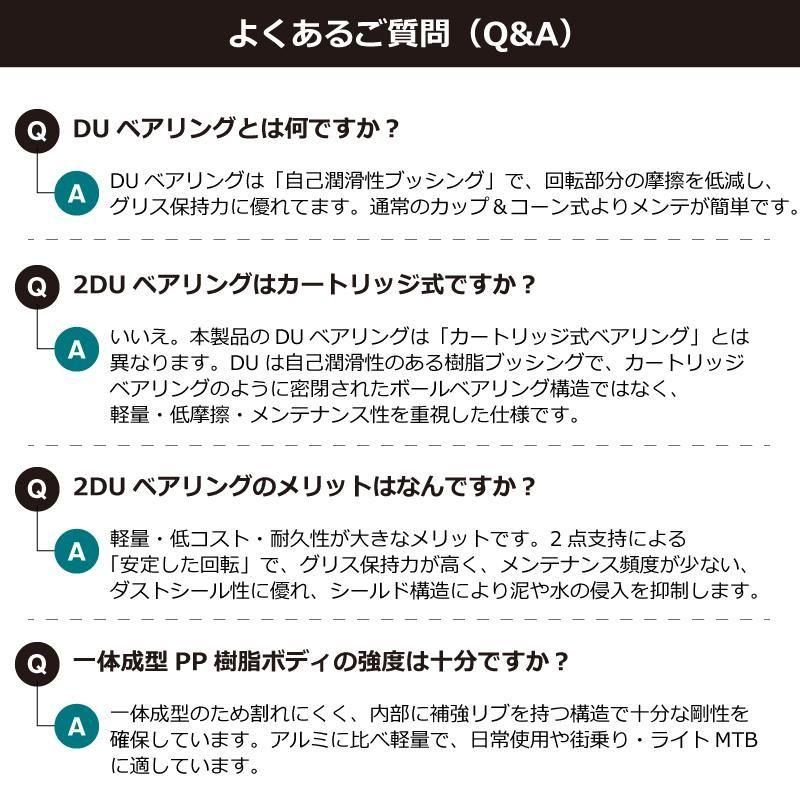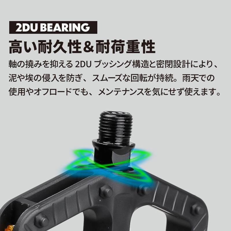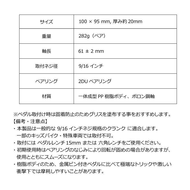 備考・注意点・本製品は一般的な 9/16インチネジ規格のクランク に適合します。 → 一部のキッズバイク・特殊車両では取付不可。・左ペダルは逆ネジ 仕様です。取付時にはご注意ください。・取付には ペダルレンチ15mm または 六角レンチをご使用ください。・初期使用時はベアリングのなじみにより回転が固めの場合がありますが、使用とともにスムーズになります。・樹脂ボディのため、金属ピン付きペダルに比べて極端なトリックや激しい衝撃下では摩耗しやすいことがあります。
