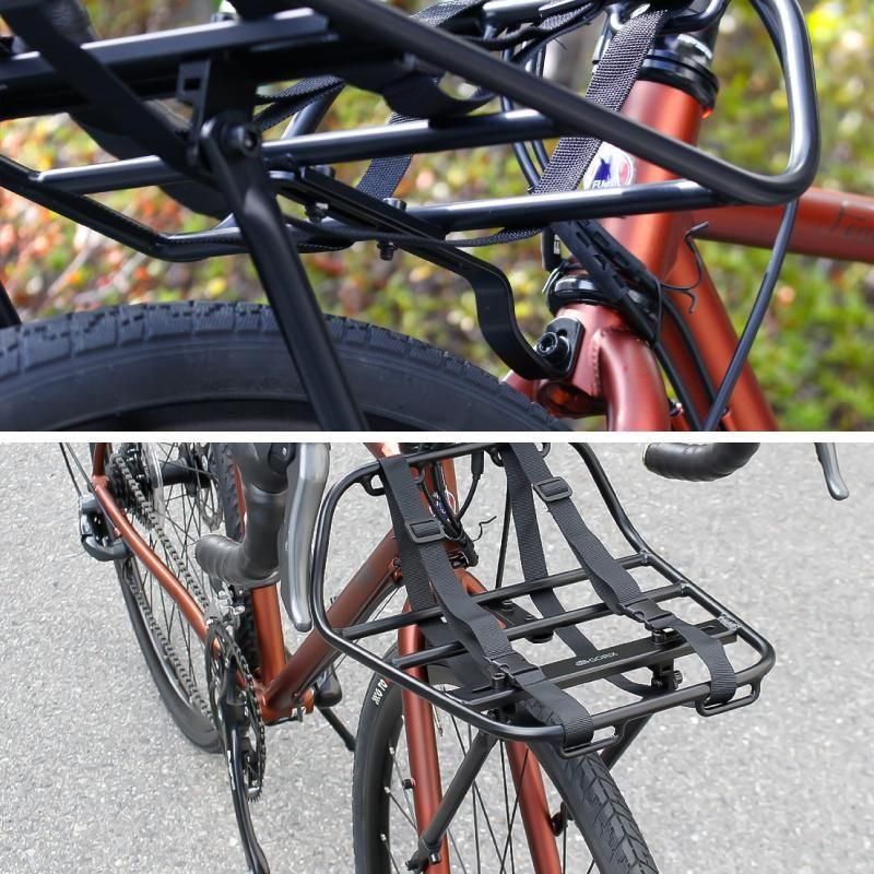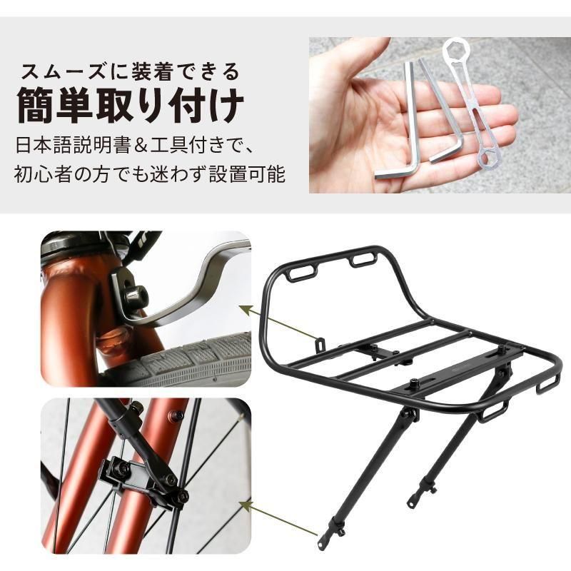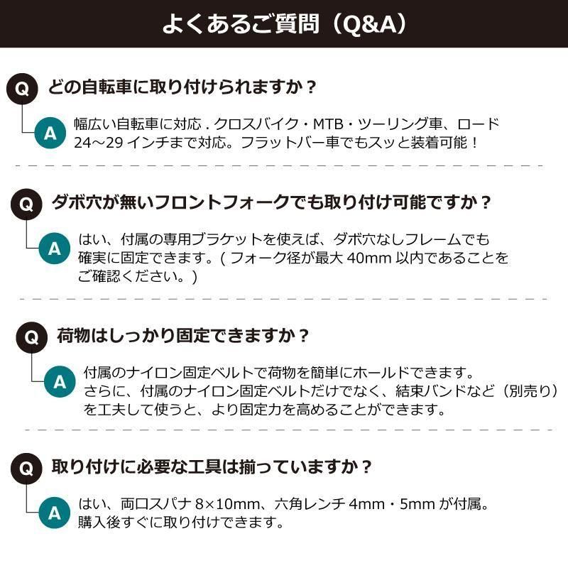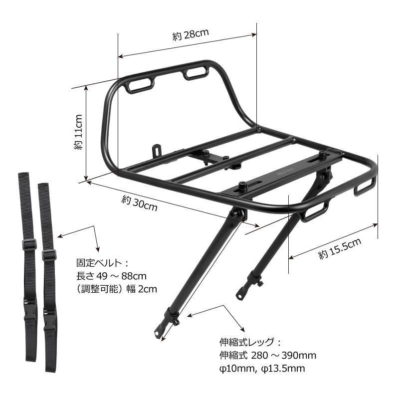 | サイズ | 荷台寸法:長さ30cm × 幅28-15.5cm × 高さ11cm/荷台固定幅:20〜28cm/荷台角度:約100°/フォークセンターブラケット(幅16mm × 全長153mm)/伸縮式レッグ(長さ280〜390mm / φ10mm, φ13.5mm)/固定ベルト:長さ49〜88cm(調整可能) × 幅2cm(ナイロン製) |